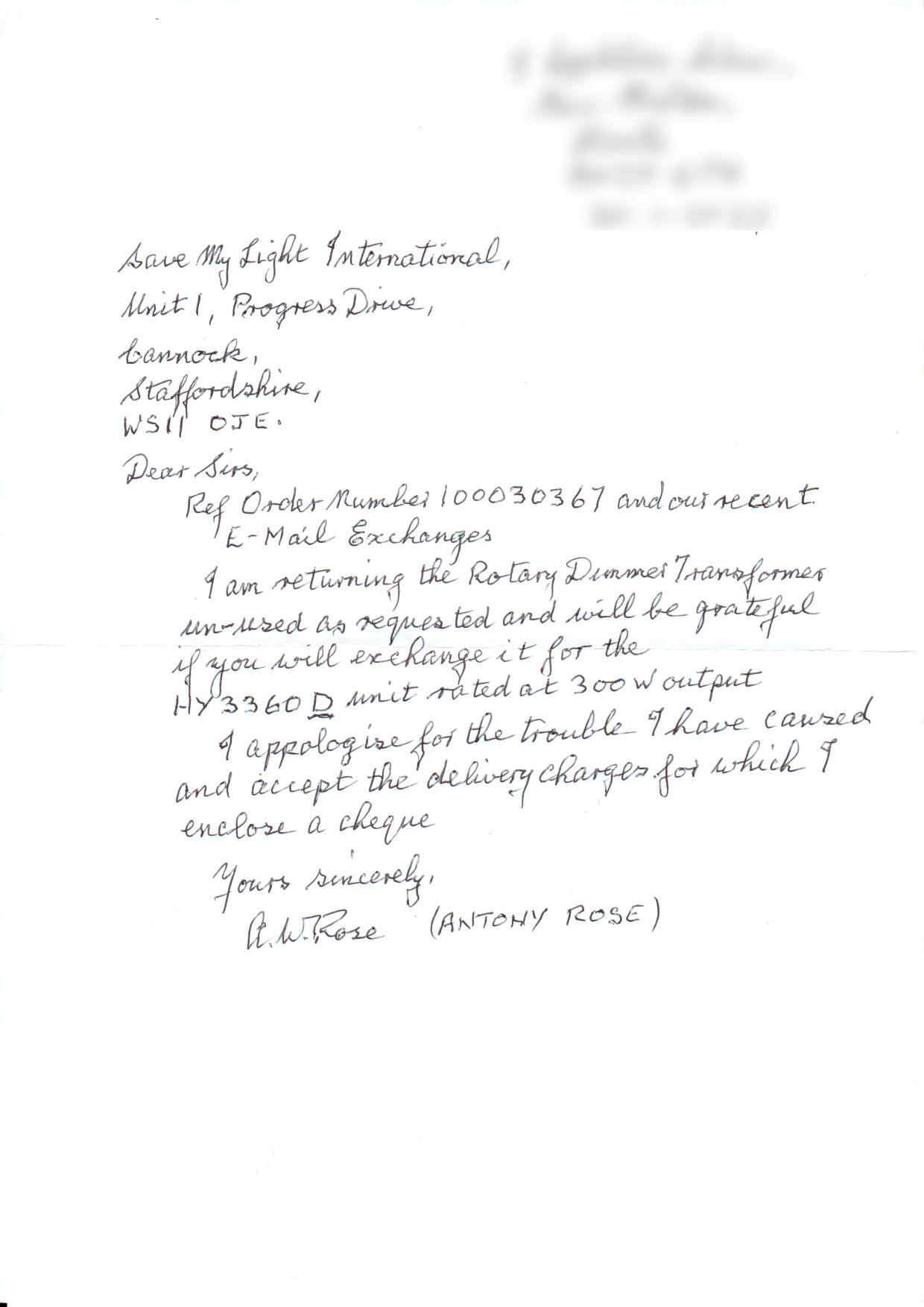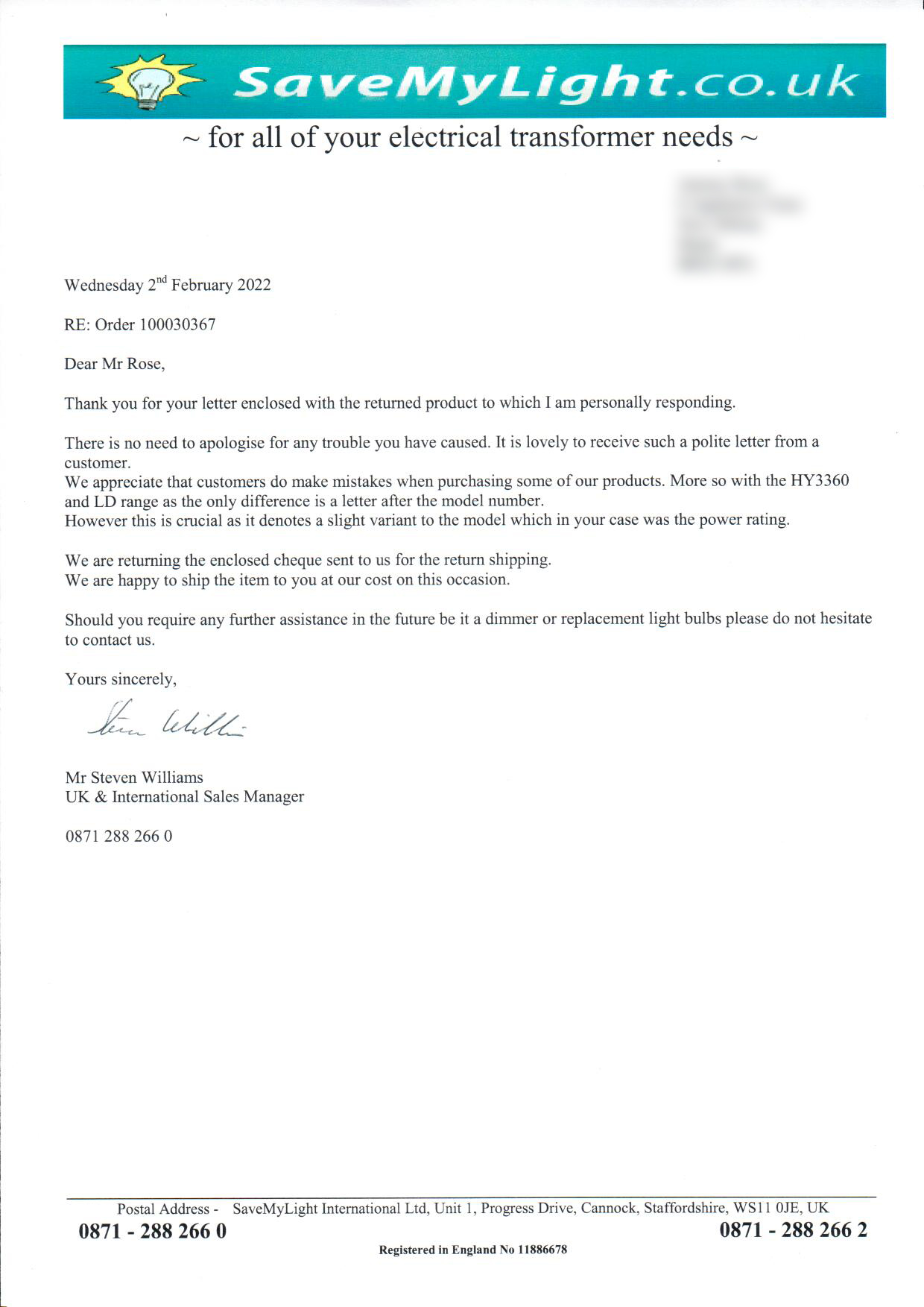 Dear SaveMyLight, Thank you for your prompt and fair action, most appreciated. Kind regards Terry Oakley Just a short note Steve for your brilliant service which is a credit to you and your team. Many thanks Dave Hughes What a fantastic service you guys offer. Sarah Hello again. Thank you for your speedy reply. A wonderful service from start to finish. BOOKMARKED G Bourne What a fantastic company to deal with. Frank Further to our phone conversation, I confirm I have received the dimmer switch and that it is installed and working as expected. Thank you Steve for all of your assistance with my customer’s troublesome light fitting. Thanks Again A service like no other! Greg Dear Management, I am emailing to say thank you for your assistance in helping me to fix my broken light fitting. D.Shaw Thanks Thanks, received this morning and just finished fitting it and it seems to be working just fine, Thank you for a wonderful service. J.Gallagher I received my order today- ordered yesterday. John Parker Just a quick email to express my thanks for supplying a SELF SLT6-350IL 6w CONSTANT CURRENT LED DRIVER for a Dimplex fire. Best wishes Brian Coutanche I am emailing to say thank you for the great advice given to me by David in your tech team. D magill Hello Steve, Fantastic service as usual. D.LONG RESPONSE Hello David, Thank you for your kind email. I am pleased we could help you. It’s what we are here for. I will pass your comments to our staff. Steve It doesn’t get any better than save my light!! Barry Hall Hello Team, I would just like to say thank you for the great service I received last week in finding me a replacement transformer. R Brown. I am emailing to say thank you for assisting me with an incorrect led plug that I ordered. D.Ellis Thank you Steve for a superb service and technical advice from David. D.Brown Fitted it today and worked a treat Dear Steve Just to say many thanks for your evening phone call, together with your advice on overcoming my problem. Both items arrived speedily and safely and we now have a perfect LED table light again. Hi Steve, Thank you so much. I appreciate it so much. Thank you for your support, we really need all the support possible ❤️ Dear Sir / Madam, Thank you for providing an efficient service and for the update. Kindest Regards Orlando Heron G’day from Oz!! Luke FANTASTIC! WONDERFUL! P.Papini Sent from Outlook for iOS Hello Steve, Just wanted to say what a wonderful service I received from Jane. Clive Thank you for your swift work getting me the light transformer to me, Peter Hildreth Thank you, it worked as a replacement. Hopefully it will last another 8years. Regards Nim Good Morning, I would like to thank Steve for the advice given to fix my broken light fitting. Mr M Killick Thanks you for all your help. You worked out the problem and I thank you very much. Respectfully Kevin McQuiston Thank you for your promt service. The dimmer arrived the next day and its another light saved. — This e-mail was sent from a contact form on SaveMyLight Thank you for the excellent advice and service I received from David in relation to my light fitting issue. John A. To sales: Thank you for sending the product I ordered. I received it rapidly and it was well packaged. Nathan Hi folks. Thanks for the help here. I was really looking forward to getting my light back working. I may have now have to replace all together. Thanks for excellent customer service, I guess these are factors outside of your control. Best regards, Hello Steve, I just wanted to thank you for the service received to fix my light. From start to finish the advice given was wonderful even for someone like me with no electrical knowledge. G.Woolley RESPONSE Mr Woolley, Yes, we are aware of these reviews. Some of the reviewers we have dealt with and others we do not know who they are. Unfortunately some of the reviewers ways of dealing with matters is to threaten the retailer with a demand. For example, free goods, compensation if their demands are not met. Steve Hello I want to thank your team for the sterling advice given to my husband to fix our light fitting. I appreciate that it is hard to diagnose a repair by telephone but your staff member david did just that. Manjit Good day, The ordered goods have been delivered, everything is fine, thank Many greeings, al Dear Steve, Thank you for your recent supply of the above dimmer. Kind regards, Thank you for brilliant service. Hello Steve, thank you all arrived safe and sound. . . . and my lamp is working again. Thanks so much. Mit freundlichen Grüßen / Best regards Hello Steve, Just wanted to say a huge thanks for your advice in getting my light fitting up and running again. Your advice at 8.30pm was just invaluable. I cannot believe you work so late. Have a great Xmas. R&S Dear Steven I want to apologise for my conduct in trying to return a product to you and for filing a chargeback on Paypal as i thought it was the only way to get my money back. L Jordan RESPONSE Dear Mr Jordan, Having read the various websites you have placed reviews on (5 to date) we are rather saddened as to how you have explained your version of events in the public domain. D.Williams Order #100035844 Great job folks. Unit arrived very quickly and 1/2 hour later our bathroom LED lit and heated mirror was back working again. Many thanks for such prompt service. Colin Message: I just wanted to express my thanks for the service you have provided. Thank you very much indeed!! I had no idea these things had a fuse! Hello, My order 100035621 is correct! p.s. I read your guidance notes and was appalled at the abuse suffered by your customer Hi, Thanks for your help and advice. You are a rare example these days. I’ll look for wireable 2din as you suggest and also order your plugs shortly. Cheers, Robert. Just a quick message to let you know my recent order arrived safely and the transformer is now fitted and in use. We had a water leak upstairs which (naturally) foun